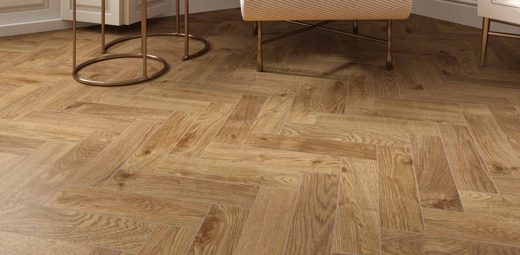 We love how the herringbone tile patterns set off the rustic beauty of these worn wood effect tiles.